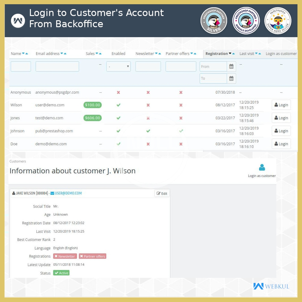- Admin can login to customers account as a customer on front office