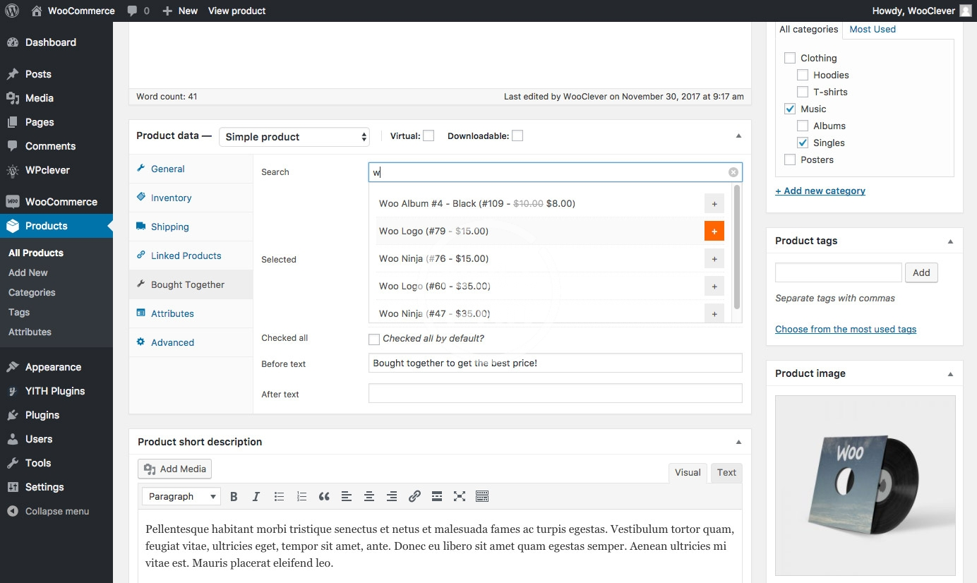 Après l'installation de ce plugin, les utilisateurs peuvent ajouter une nouvelle offre en naviguant vers la section Produits Data sur la page du produit. C'est facile d'ajouter des articles liés en entrant une mot-clé dans la boîte de recherche et en les affichant sous forme de liste sous la description du produit. Il est possible de déplacer un article pour réorganiser l'ordre. Il a été prouvé que lorsque vous montrez des articles supplémentaires dans l'ordre de la plus proche à la moins, il y a une chance plus élevée que les clients prennent l'offre.