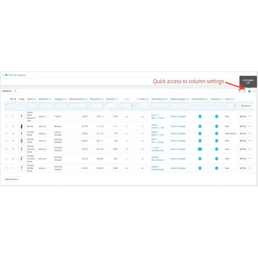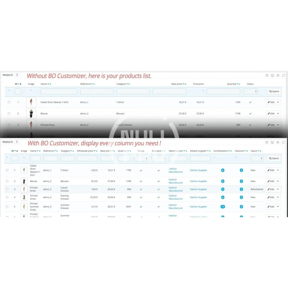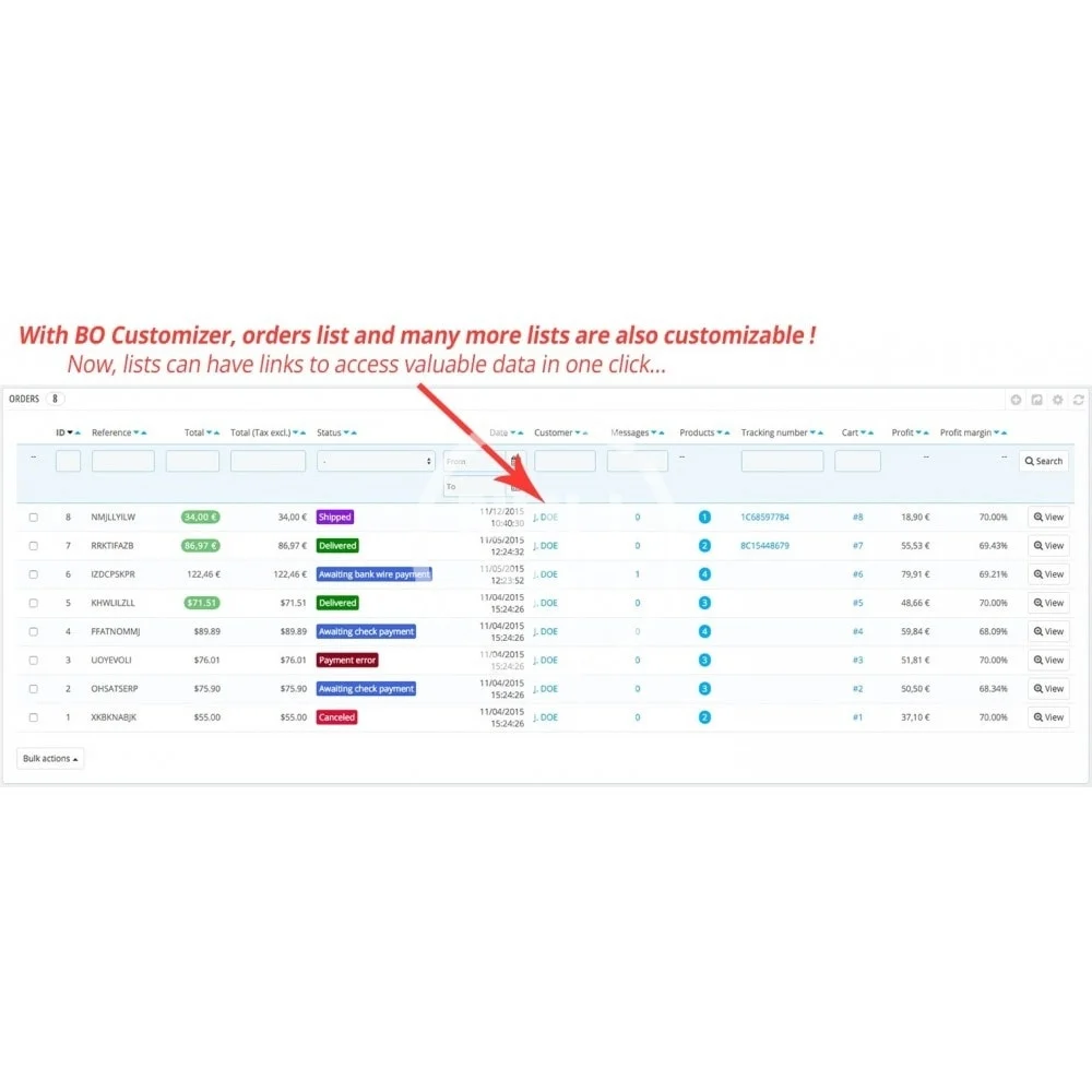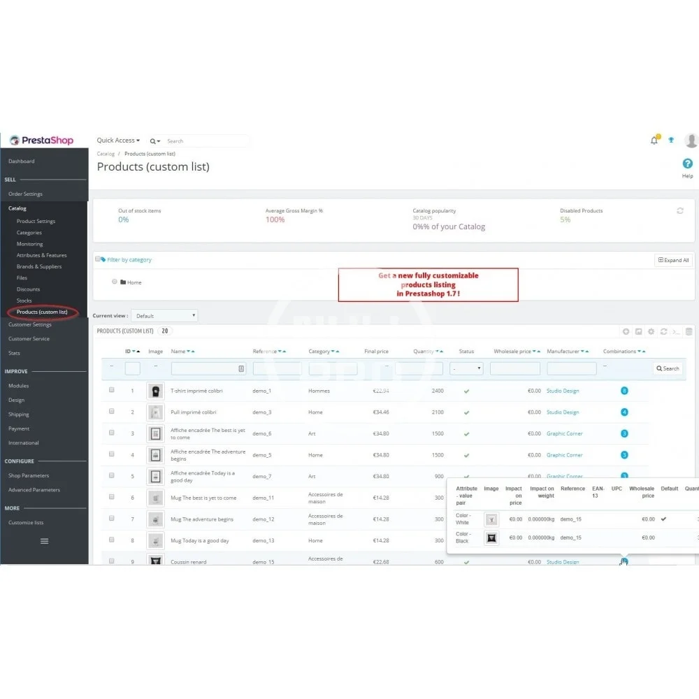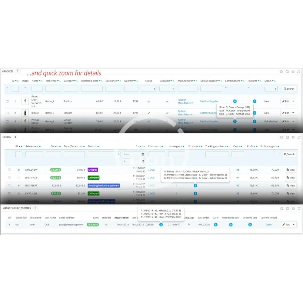 Customize the Prestashop back-office by choosing the informations to display on the Products, Orders, Clients, Carts, Messages listings. Consult and export your catalog, stocks, sales and margins easily.