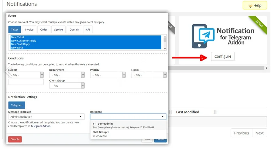 - Go to Setup > Notifications click "Configure" on Notification for Telegram Addon.
