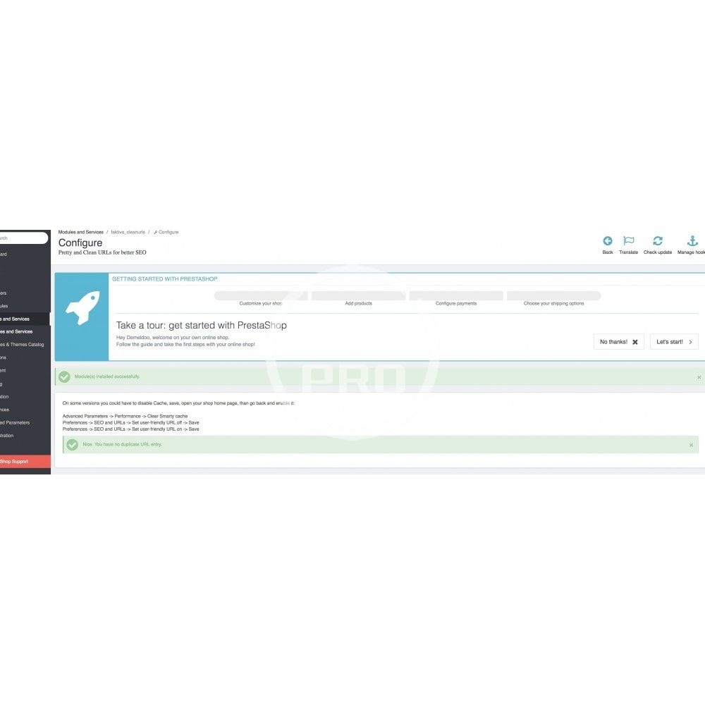 - Removes IDs from all URLs generated by Prestashop system like category, product, manufacturer, supplier, module, cms.