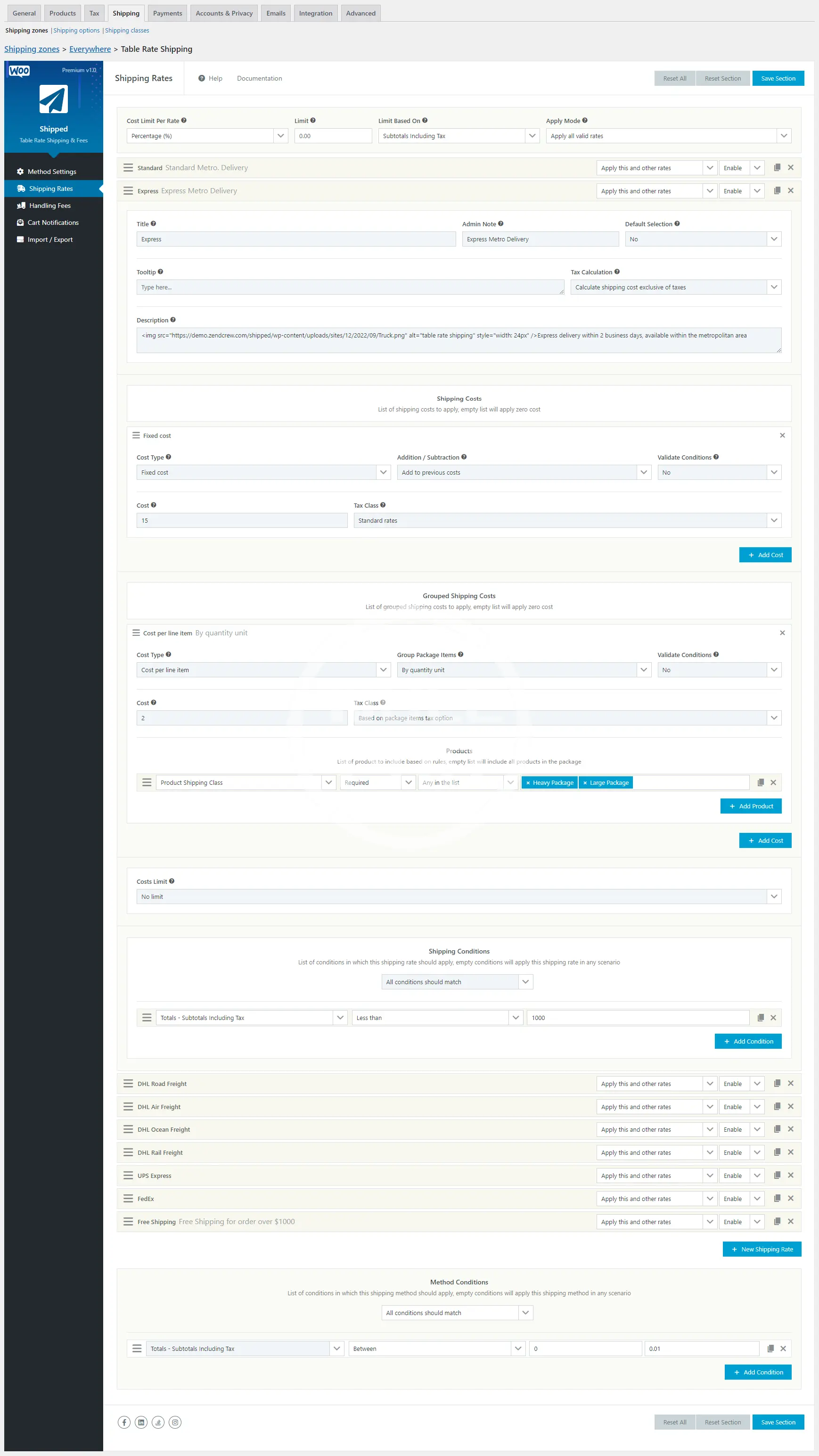 WooCommerce Table Rate Shipping is a powerful, flexible and easy-to-use shipping plugin for WooCommerce, it can be used to create multiple shipping rates based on product rules and conditions.
