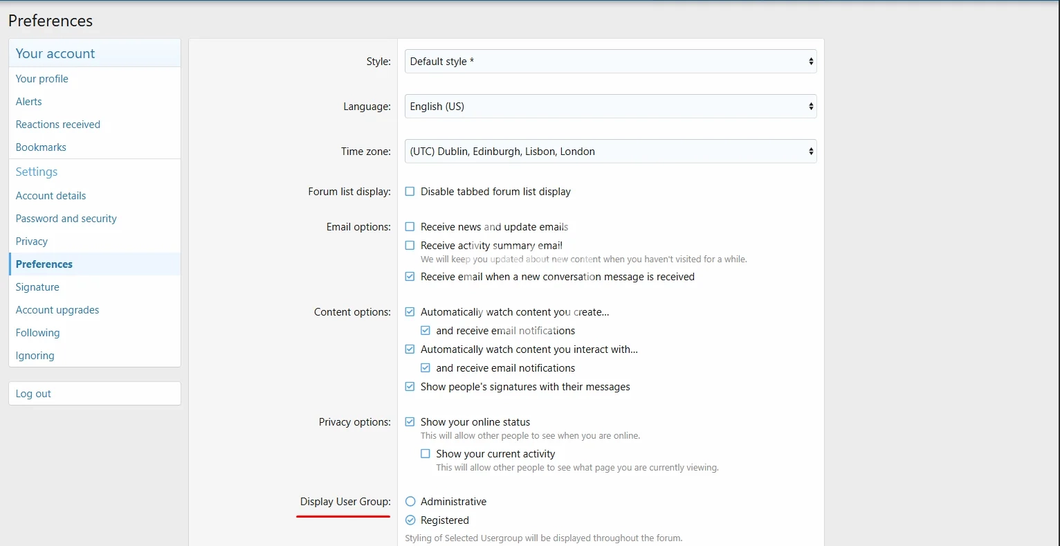The user can go to Account Preferences (account/preferences) and select the desired group to display.