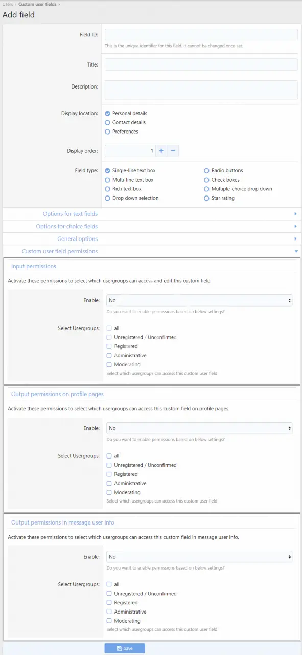 - Output permissions on profile pages: select which usergroups can access the custom field on profile pages